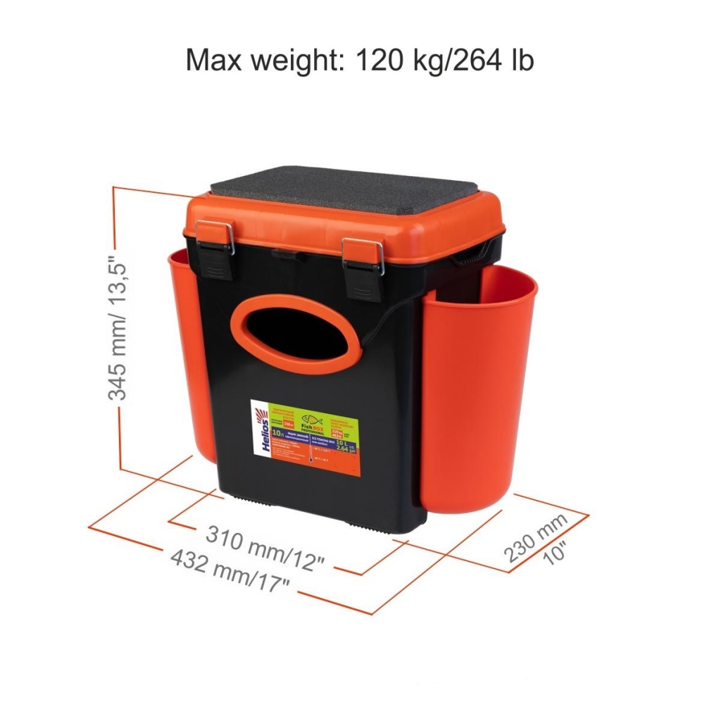 • Длина (с учетом навесных карманов): 432 мм. • Длина (без навесных карманов): 310 мм. • Высота: 344,5 мм. • Ширина: 230 мм. • Нагрузка: 120 кг. • Материал - морозоустойчивый, ударопрочный пластик, который не впитывает и не пропускает воду. • Вес: 1,85 кг. • Объем основного отделения: 10 л. • Цвет: оранжевый.