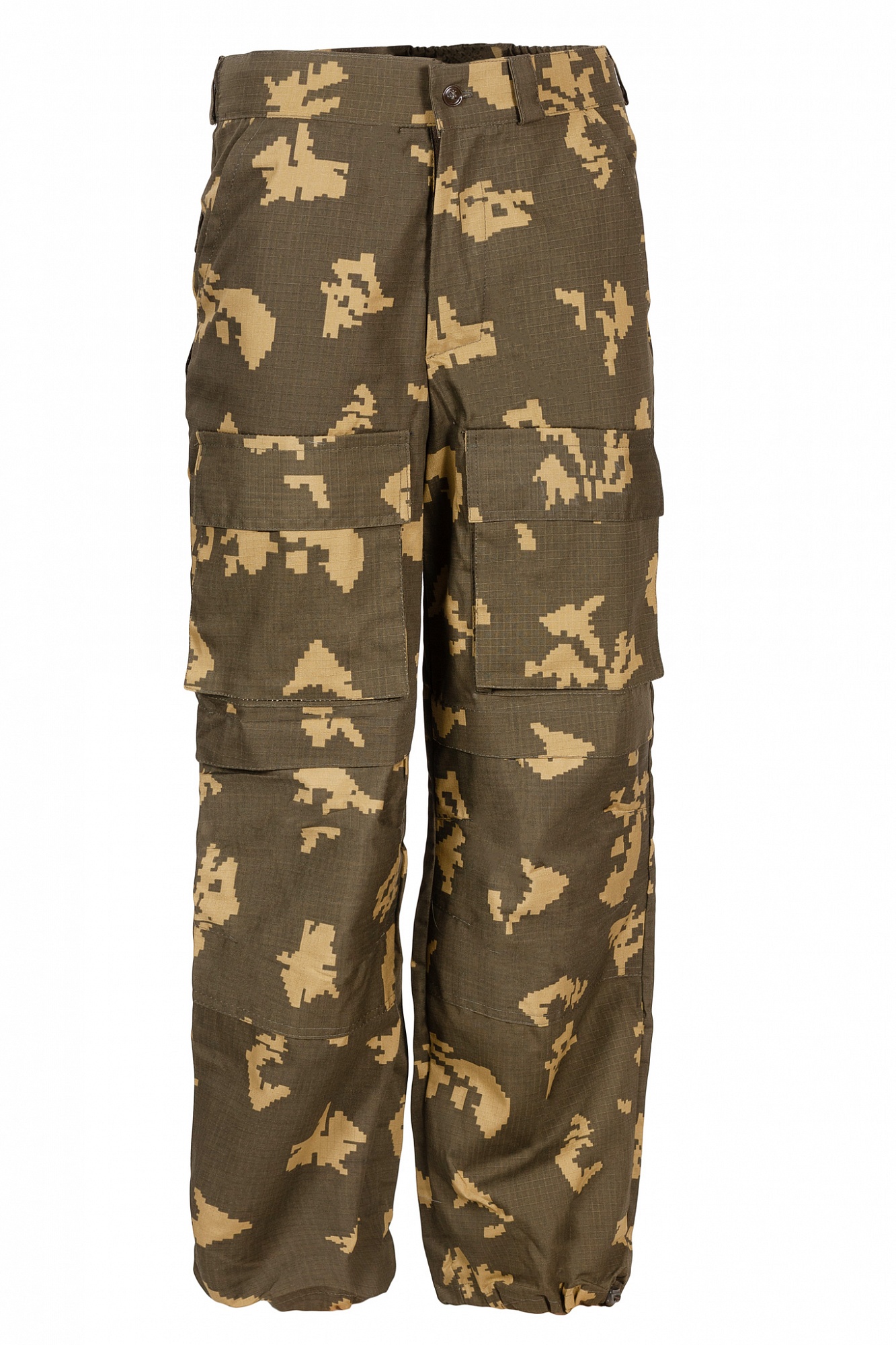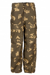Брюки прямого силуэта на поясе. На передних половинках брюк расположены боковые карманы с наклонным входом, ниже расположены накладные объемные карманы с клапаном и наколенники. На задних половинках брюк расположены накладные объемные карманы с клапаном и карманы для инструментов. Ширина брюк по низу регулируется с помощью шляпного шнура.