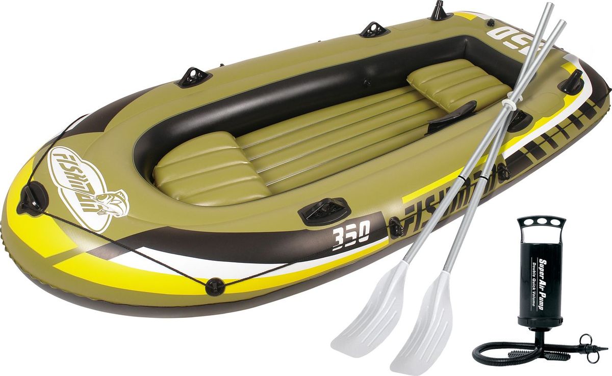 Лодка надувная Jilong Fishman 350 Set Fishman 350 Set — это отличная надувная лодка, которая сделана из высокопрочного поливинилхлорида. Грузоподъемность до 340 кг, подойдет для трех взрослых. В комплекте есть весла и помпа, пластиковые весла 124 см, есть сумка для снастей, крепления для весел и держатели для удочек. Такая лодка поможет вам в путешествиях, рыбалке и просто активном отдыхе.