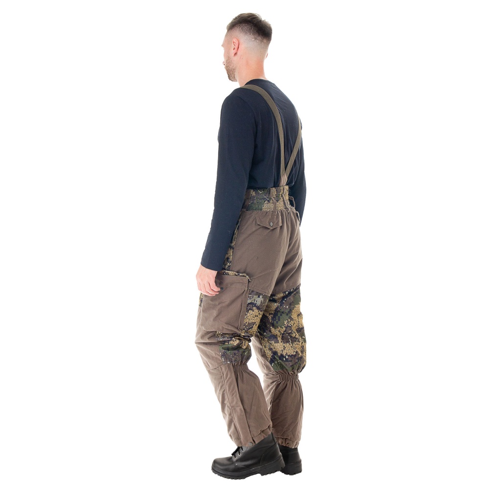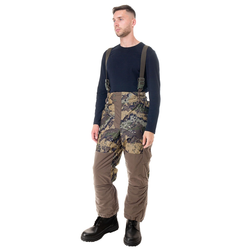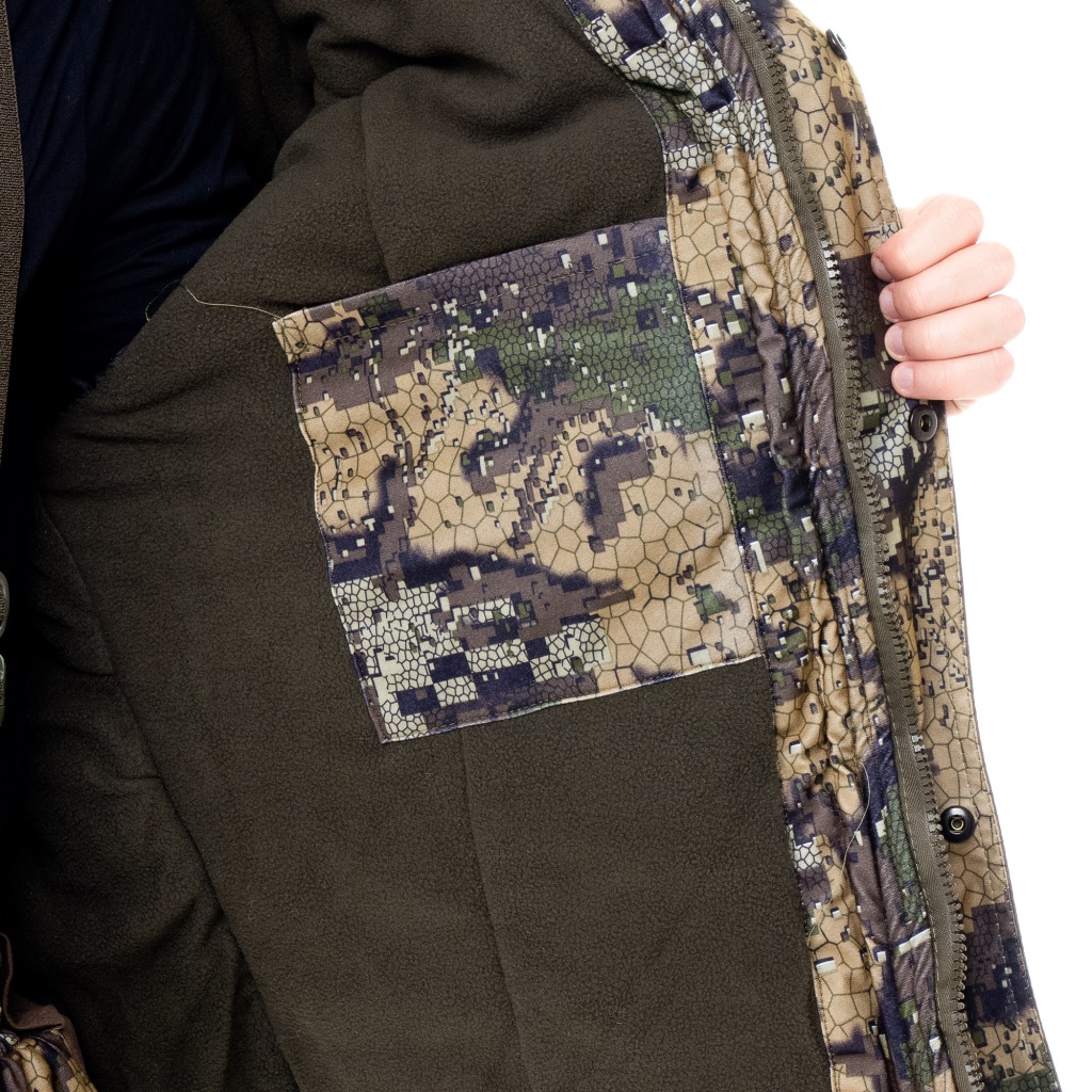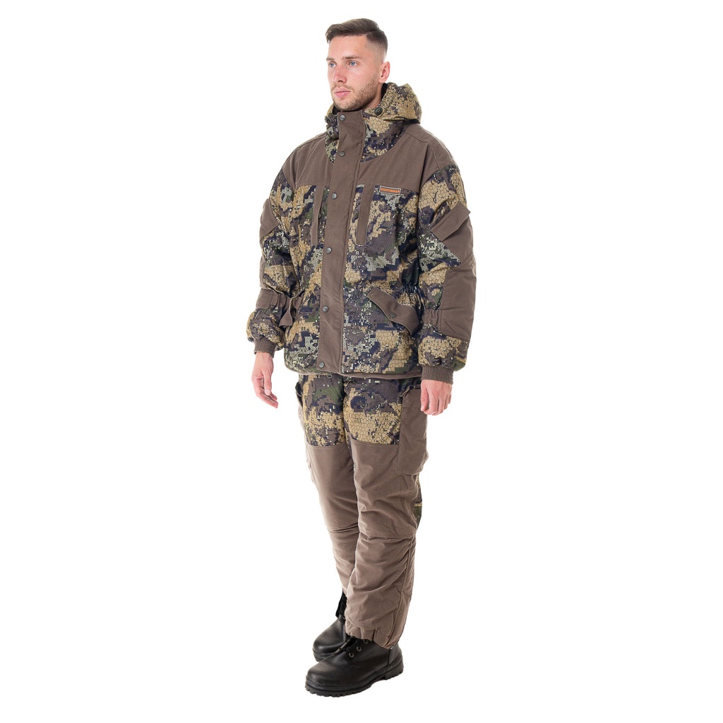 Костюм состоит из куртки и брюк на подтяжках. Костюм садится по фигуре, в нужных местах затягивается, что делает его идеальным для ходовой охоты или любой другой активной деятельности, не стесняет движений. Куртка имеет центральную застежку на молнии. Для защиты от продувания производитель оснастил ее ветрозащитной планкой, которая пристегивается кнопками. Куртка имеет регулируемый объем. Ее можно утягивать в талии и по низу с помощью эластичных шнуров. Основной материал верха ткань АЛОВА МЕМБРАНА - беспорая мембрана с характерным мелким бархатистым ворсом, который не дает этой плотной ткани шуршать. На ощупь ткань мягкая и приятная, на морозе не топорщится и не теряет своих свойств. Подкладка из флиса прекрасно дополняет костюм. Флис не только греет и сохраняет тепло, но и отводит влагу от тела.